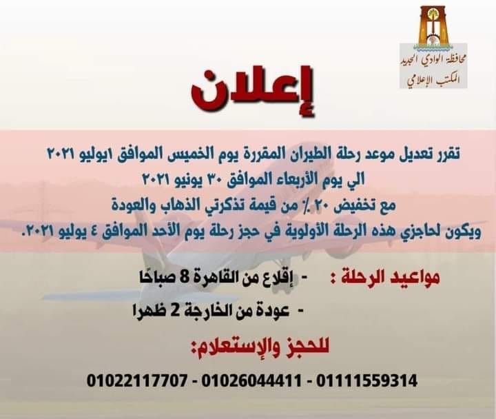 خصم 20%علي تذاكر الطيران من الوادي الجديد والعودة بمناسبة ثورة يونيو