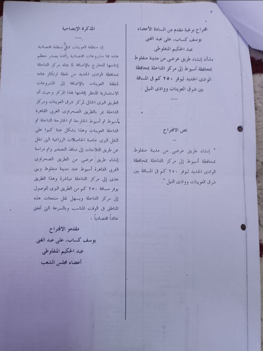 وللتوضيح النواب مارسوا دورهم فى الضغط ولا يمكن للطريق أن يتم لولا دور الجهاز التنفيذى واصراره ممثلا فى اللواء دكتور محمد سالمان الزملوط محافظ الوادى الجدبد وبقية اجهزة الدولة