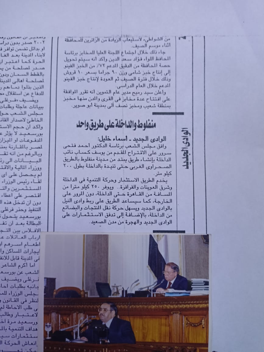 فى خريف عام ١٩٩٠ بينما كنت مترجلا من منزلنا فى المنطقة البحرية الغربية بقرية الهنداو ( الوصف خاص لأهل القرية وأبناء الداخلة الذين يعرفون معالم القرية ) قبيل الظهيرة وعند مدرسة الهنداو الابتدائية القديمة قابلت رجلا يبدو وكأنه فى منتصف عقد الخمسينات من عمره يترجل على قدميه ويمسك بشمسية ( مظلة) فى يده للحماية من الشمس وبمفرده بدون ما يسمى بالحملة والزفة والمتاديب والمواكب ..مرتديا بدلة سفارى ..وأنا لا اعرفه ..وكان يسير فى اتجاه الغرب بينما كنت اسير فى اتجاه الشرق …فاقترب منى وصافحنى وكان العرق يتصبب من وجهه ورحبت به كونه غريبا ليس من القرية …فعرفنى بنفسه قائلا …أنا بوسف كساب من القصر وعايش فى موط مرشح لعضوية مجلس الشعب وجاى بدعى لنفسى ونتمنى توقفوا معانا انا موظف بسيط فى الصحة..وعايزين حد من الناس البسيطة يمثلنا فى المجلس ..فقلت له ان شاء الله يا حاج ربنا يوفقك …ولم اكن وقتها مهتما بهذا الشأن ولم يوفق الرجل فى انتخابات ١٩٩٠ ثم خاض انتخابات ١٩٩٥ ولم  يوفق… ولم ييأس حتى كتب له النجاح مستقلا امام مرشح الحزب الوطنى فى انتخابات ٢٠٠٠ ووقتها وفى نفس العام انتقلت للعمل كمحرر برلمانى داخل مجلس الشعب مصادفة …لتشاء الظروف أن التقى واقترب من هذا الرجل المكافح المثابر البسيط رحمه الله ولى معه حكايات ومواقف واحداث كنت فيها شاهدا على العصر داخل اروقة البرلمان وخارجه وشهد معى مولد أول جريدة تحمل اسم المحافظة عام ٢٠٠٤…وشهادة للتاريخ كان هذا الرجل ومعه زميله المهندس على عبد الغنى أول من تقدموا باقتراح برغبة لانشاء طريق تنيدة منفلوط فى لجنة الاقتراحات والشكاوى ( مرفق المستندات) ..ثم اكمل بعدهم النائبان الدكتور محمد خليل والاستاذ محمد محمدين فى دورة ٢٠٠٥- ٢٠١٠ حيث تم اعتماد اول ١٠ ملايبن جنيه من جهاز التعمير فى وزارة الاسكان للطريق فى عهد الدكتور محمد والاستاذ محمدين واكمل الضغط والمشوار النائبان برديس سيف الدين وتامر عبد القادر فى برلمان ٢٠١٥ ثم واصل النائب  تامر الذى اعيد انتخابه جهدا خاصا فى المرحلة الأخيرة  ومعه زميله حمدى محمد حسن فى برلمان ٢٠٢٠ وكل ادلى بدلوه وخاض معارك فى هذا الملف وأن تفاوتت الجهود من نائب لآخر كل حسب قدراته وعلاقاته   …ونحن كاعلام كان لنا دورا فى فتح الملف اكثر من مرة منذ تسعينات القرن الماضى حيث كتبنا مقالات ساخنة وقوبة فى مطلع تسعينات القرن الماضى وواصلنا الضغط حتى النهاية